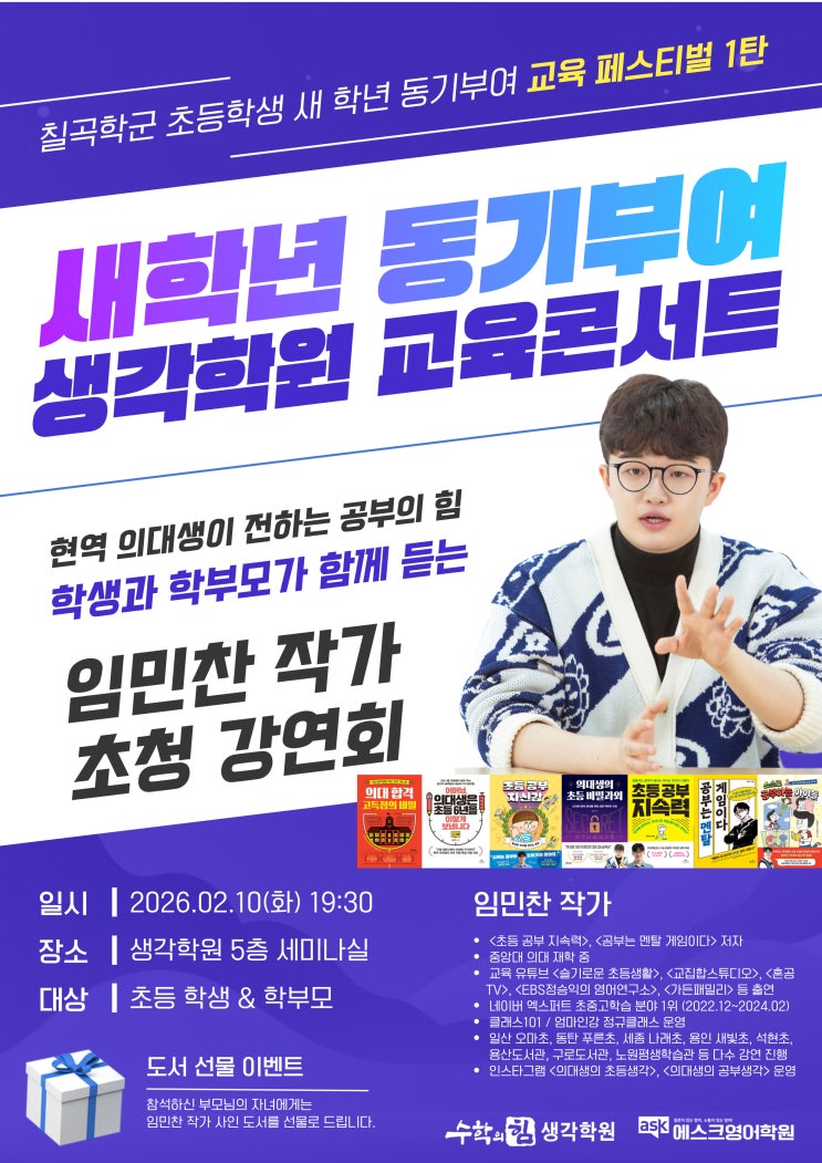 2026년 새 학년을 앞둔 2월, 칠곡학군 초등학생들과 학부모님을 위한 특별한 만남이 준비되었습니다. 2월 10일, 임민찬 작가 초청 강연회 이번 강연회는 단순한 입시 정보 전달이 아닌 아이들이 공부를 대하는 마음가짐을 다시 세우는 ‘새 학년 동기부여 교육 페스티벌’로 기획되었습니다. 새 학년 동기부여 교육 콘서트 임민찬 작가 초청 강연회 일시: 2026.02.10(화) 19:30 장소: 생각학원 본관 5층 세미나실 ‘새 학년 동기부여 교육 페스티벌’이란? 수학의힘 생각학원 & 에스크 영어학원이 준비한 칠곡학군 초등학생과 학부모님을 위한 특별 기획 교육 페스티벌입니다. 아이들이 3월 새 학년 새 학기를 맞이하며 막연한 부담이 아닌 기....... <img src="https://blogthumb.pstatic.net/MjAyNjAxMjdfMjI4/MDAxNzY5NTA1Mjc5NTQy.kV8FNDNdglCiwvWY-N2aKZJe6skD4UawHtPHpBf_jOsg.Mltkj2cZ0bjhHKMKQgFkK9L9lRGIS5LOBZufXXCQU1og.JPEG/%C0%D3%B9%CE%C2%F9_%C3%D6%C1%BE_%C6%F7%BD%BA%C5%CD.jpg?type=s3" />
