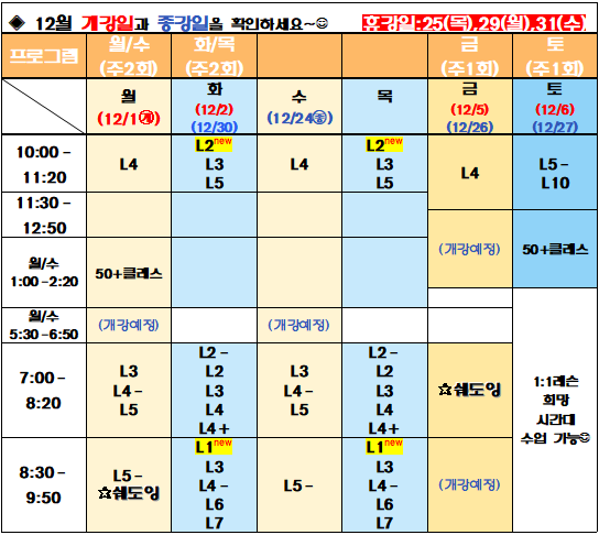 [남양주 호평동 성인 영어회화 전문학원 프렌즈어학원] 12월 시간표↓↓ 기초레벨인 L1은 모든 시간에 현재 대기를 받고 있는 중이니 참고해주세용~~ :) 쉐도잉 수업은 주 1회 진행 되어요! 50+클래스를 오픈 했어요! 편하게 문의 주세요! :) 시간표에는 없지만 [월/수 5시30분]에도 수업 진행 예정입니다~! 10단계 레벨이 있기 때문에 시간표는 참고만 하시고, 정확한 확인을 위해 레벨테스트(5분 정도 소요)를 받아주세요 맞는 레벨에 들어가는 것은 무척 중요합니다! (아래 카카오톡을 이용해서 방문예약을 해 주세요~!) 단, 레벨1이 아닌 분들은 언제라도 Join하실 수 있어요! 카카오톡 문의는 아래 링크를 클릭해 주세요! :) ▼▼▼ https:/....... <img src="https://blogthumb.pstatic.net/MjAyNTExMjhfNjIg/MDAxNzY0MzI4NjkzNDIz.hdwbV0LUz4xkkpDAJsxp5YLR-Aiu_nnasIQ4imHeU2kg.bcsUDjaYphOfoow3FzpahQBs7NM8RD4Gp5KvscvR0I0g.PNG/12%BF%F9_%BD%C3%B0%A3%C7%A5.png?type=s3" />
