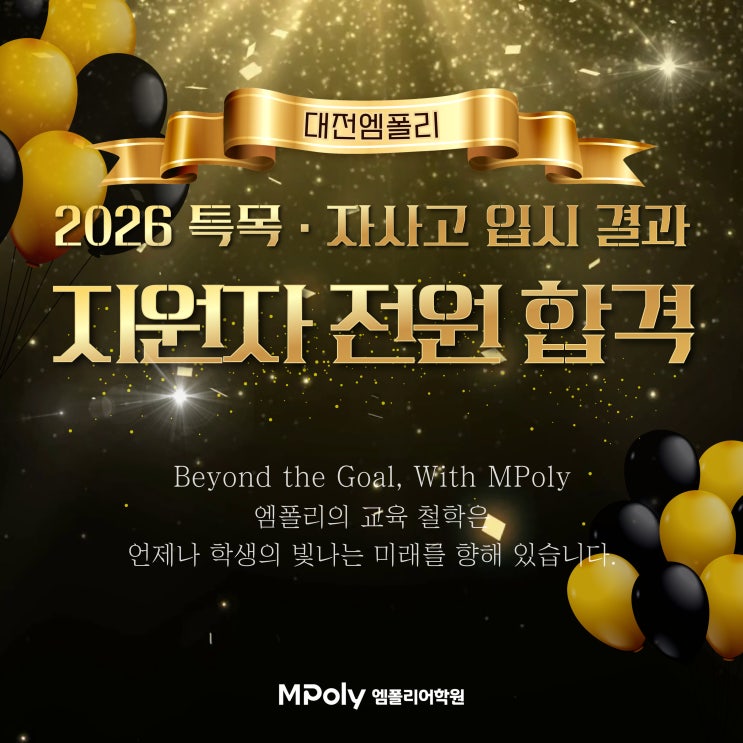 2026학년도 주요 고교 합격 현황 1. 공주사대부고 2. 대전외고 3. 세종국제고 4. 대신고 5. 민사고 6. 용인외대부고 "Beyond the Goal, With MPoly" 엠폴리의 교육 철학은 언제나 학생들의 미래를 향해 있습니다. 단순한 합격을 넘어, 더 넓은 세상으로 나아갈 우리 학생들의 새로운 시작을 진심으로 축하합니다. <img src="https://blogthumb.pstatic.net/MjAyNjAxMTRfMTY0/MDAxNzY4MzgyMzkwNzE2.FyNT93L_b815RYNN_Wuw49OZub4zeB-pD63i6YimZ3Qg.BLTVoE-RLKmZ2FyO4OVC6FEfAjRGrJN_Ab3lRXfxzU0g.JPEG/001.jpg?type=s3" />
