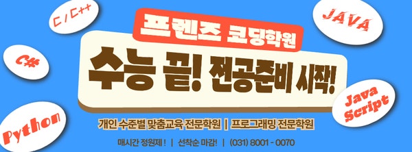 안녕하세요? 수원역 바로 옆 정차역인 화서역 건너편 숙지 중학교, 숙지 고등학교 앞에 위치한 프로그래밍 전문학원 프렌즈코딩학원입니다 11월 13일(목) 수능시험일입니다 그동안 수능시험을 목표로 열심히 노력하고 고생한 우리 학생들 모두가 좋은 결과 있기를 바랍니다! 수능 시험 결과로 인해 좌절하거나 인생을 포기하는 슬픈 일이 없기를 바랍니다 프로그래밍 관련 학과로의 진학을 희망하는 학생들에게는 입학 전 프로그래밍 전공 교육 과정을 미리 학습할 것을 적극 추천합니다 프로그래밍 전문학원 프렌즈코딩학원에서는 프로그래밍 관련 학과로 진학을 준비하는 여러분들을 위해 C언어 프로그래밍 C++ 프로그래밍 파이썬 프로그래밍 자....... <img src="https://blogthumb.pstatic.net/MjAyNTExMDhfMjk3/MDAxNzYyNTY4NzcwNjMy.DOHTW5lSWTtfKYgvDzw3-z-R-dobyeQr2qXK1H1DiUsg.KRIuBAxYAFVUOxQIsdeNCua7xOjepBXFJomxqZEt8fEg.JPEG/041_%BC%F6%BF%F8%BF%AA_%C4%DA%B5%F9%C7%D0%BF%F8_%C7%C1%B7%BB%C1%EE%C4%DA%B5%F9%C7%D0%BF%F8_%BC%F6%BF%F8%BF%AA_%C7%C1%B7%CE%B1%D7%B7%A1%B9%D6%C7%D0%BF%F8_C%BE%F0%BE%EE_C%2B%2B_%C6%C4%C0%CC%BD%E3_%C0%DA%B9%D9_%C0%DA%B9%D9%BD%BA%C5%A9%B8%B3%C6%AE_%B0%ED%B5%EE%B5%BF_%B8%C5%B1%B3%B5%BF_%C1%A4%C0%DA%B5%BF_%C3%B5%C3%B5%B5%BF_%C0%B2%C0%FC%B5%BF_%BC%F6.jpg?type=s3" />