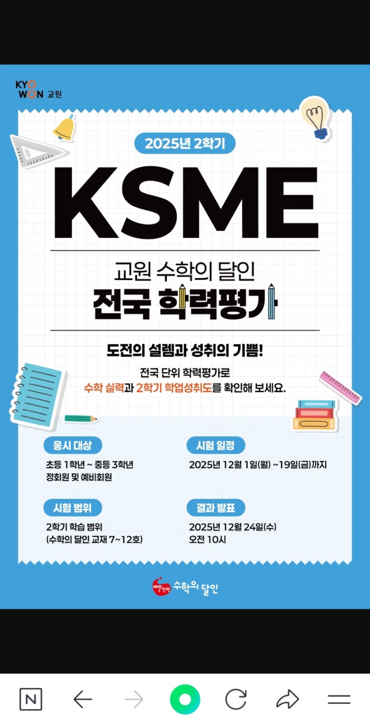 ⭐️ 2025년 2학기 KSME 전국 학력평가 안내 “아이의 수학 실력, 객관적으로 확인할 수 있는 가장 신뢰도 높은 평가!” 안녕하세요, 탑영수학원(고덕초·율포초) 입니다. 늘 아이들을 아끼고 세심하게 지도하고 있는 원장으로서, 오늘은 학부모님들께 꼭 안내드리고 싶은 중요한 소식, 바로 2025년 2학기 교원 ‘수학의달인’ KSME 전국 학력평가에 대해 자세히 소개드립니다. 저희 학원은 평소에도 기초 개념 → 유형 학습 → 응용력 확장 → 서술형 대비 → 실전 테스트까지 체계적인 학습 로드맵을 운영하고 있습니다. 특히 수학의달인 프로그램을 통해 학생 개개인의 수준을 정확히 진단하고, 부족한 부분과 강점을 세밀하게 분석하여 맞춤형....... <img src="https://blogthumb.pstatic.net/MjAyNTEyMDRfMjEg/MDAxNzY0ODUyMDgyOTk0.g8-hc56sExQX4XoiwDvBWyoBXeqd9mnhJH2zxb5Shjwg.Ferc2fkub_LiIZ72g1o03D5djYio_py1JmxdtcH6BZgg.JPEG/900%A3%DFNSC20251204%A3%DF153226.jpg?type=s3" />