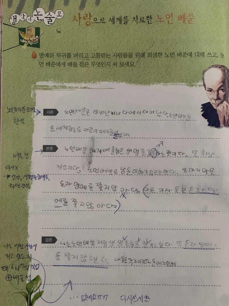 안녕하세요! 갈뫼초, 백운초, 덕장초 친구들이 즐겁게 글을 쓰는 곳! 갈뫼중, 내손중 수행평가까지 든든하게 대비하는 내손동 스마트 국어·수학 학원입니다. "우리 아이는 책은 곧잘 읽는데, 독후감을 쓰라고 하면 한 줄 쓰기도 힘들어해요." "내용은 다 안다는데, 정작 자기 생각은 한마디도 못 적어내려가네요." 논술 수업을 고민하시는 어머님들의 가장 큰 고민, 바로 ‘읽기’와 ‘쓰기’ 사이의 높은 벽입니다. 읽은 내용을 내 것으로 소화해서 글로 뱉어내는 건 결코 쉬운 일이 아니니까요. 우리 학원 친구가 직접 쓴 '노먼 베순' 논술 수업 사례를 통해, 저희가 이 벽을 어떻게 함께 넘고 있는지 보여드릴....... <img src="https://blogthumb.pstatic.net/MjAyNjAzMjBfMjY0/MDAxNzczOTg1ODU2MzQ3.z4urhiA37-5ft_pgP5X-A9ZeSdZMxQp9qDbLrSpFwDUg.vsjqfqq08i1Tvn_58qee75t5GZ-HbMrCRlb_SJaHvaEg.JPEG/KakaoTalk_20260318_194348897_01.jpg?type=s3" />