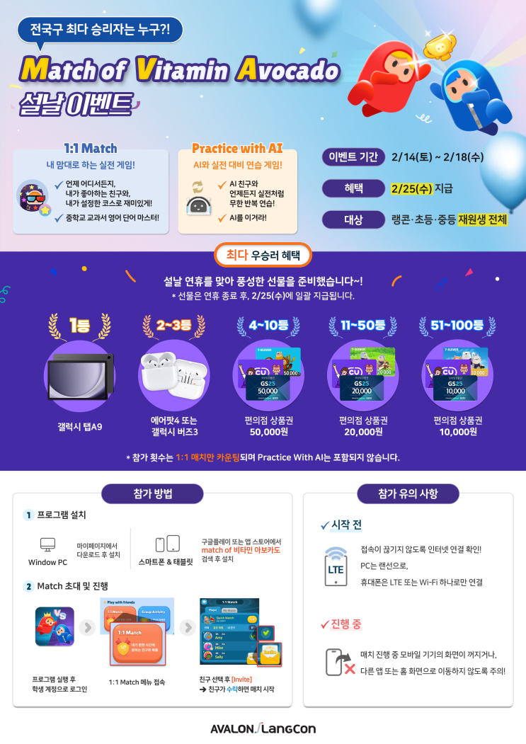 안녕하세요. 아발론랭콘어학원 광주매곡캠퍼스입니다. 설날 연휴 동안 진행된 본사 이벤트 MATCH OF AVOCADO에서 우리 캠퍼스 학생들이 상위 100명 수상자에 선정되어 기쁜 소식을 전해드립니다! ✅ MATCH OF AVOCADO 설날 이벤트란? 본사 아발론에서 설날 연휴 기간 동안 진행한 온라인 매치 이벤트로, 학생들이 온라인 매치에 많이 참여하며 즐겁게 실력을 점검할 수 있도록 준비된 프로그램입니다. 이번 이벤트에서는 " 전국 참여자 중 ‘참여 횟수 상위 100명 " 을 선정하여 등수별 선물을 지급했습니다. 우리 광주매곡캠퍼스 수상 결과 이번 시상에서 우리 캠퍼스 학생 2명이 수상했습니다! 정연성(남) 학생: 50등 안 진....... <img src="https://blogthumb.pstatic.net/MjAyNjAyMjZfMTAz/MDAxNzcyMDg3NjA4Njkz.EMSZr1MCRXXNhScBbJywTLUhS463mO_7rOxGVV1kfLog.ZG1m1KeyNH5QxSGUrJMxFBKY00p6UfuRVOhur-RlFMMg.PNG/%BC%B3%B3%AF%C0%CC%BA%A5%C6%AE_%BE%C6%BA%B8%C4%AB%B5%B5.png?type=s3" />