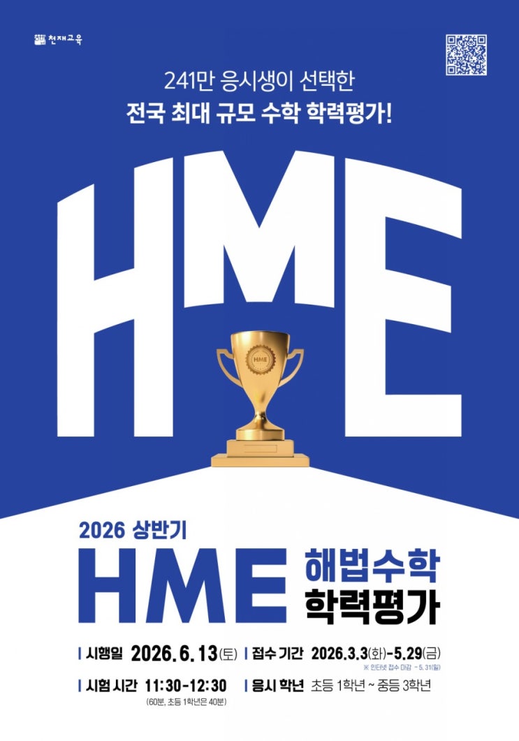 HME 전국수학 학력평가 경시대비 특강반 개강 ○ 모집 대상 : 초등학교 6학년 ○ 사전 선발고사 : 4월 1일(수) ○ 특강 개강 : 4월 6일(월) ○ 시험 일정 : 2026년 6월 13일(토) 안녕하세요! 스마트영어전문학원입니다. 완연한 봄기운과 함께 우리 아이들의 학습 열기도 뜨거워지는 3월입니다. 초등 고학년의 끝자락인 6학년, 이제는 단순한 계산력을 넘어 전국 단위에서의 객관적인 실력 점검이 필요한 시기입니다. 이에 저희 스마트학원에서는 국내 최대 규모의 수학 학력평가인 HME 수학경시대회 대비 특강을 전격 개강합니다. 2026 상반기 HME 시험 정보 1. 시험 일시 : 2026년 6월 13일(토) 예정 2. 시험 장소 : 스마트영어전문학....... <img src="https://blogthumb.pstatic.net/MjAyNjAzMjZfMTAy/MDAxNzc0NTIxMTMzNzgz.DM-YMM58Wq-5wDJeIbeOFbALS6in_o6lD6-60pXu3Qcg.WhUcdXaG-NEp9rWZZ9PDCs0-CeOVrnV4zfiniipiPH8g.JPEG/1774521133559.jpg?type=s3" />