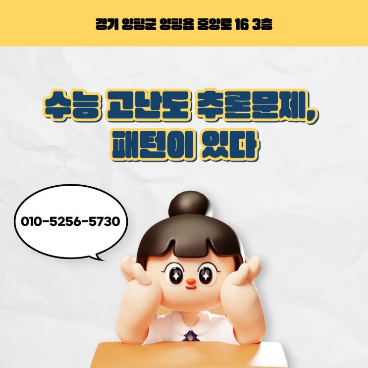 안녕하세요. 양평수능영어 고송희영어입니다. 오늘은 수능영어에서 가장 까다로운 영역, 바로 ‘추론 문제’에 대해 이야기해보겠습니다. 수험생이라면 한 번쯤 “추론은 감으로 푸는 문제 아닌가요?” 라고 생각해본 적 있을 겁니다. 하지만 결코 그렇지 않습니다. 추론 문제에도 명확한 패턴이 존재하며, 이를 이해하면 정답률이 달라집니다. 추론 문제, 감이 아닌 구조로 접근하라 수능영어 추론 문제는 단순히 글을 읽고 느낀 대로 푸는 문제가 아닙니다. 글의 구조 속에서 논리의 흐름을 따라가야 합니다. 추론 문제의 본질은 ‘글쓴이의 의도’를 찾아내는 것입니다. 따라서 주어진 문장보다 문맥을 읽는 능력이 핵심이죠. 양평수능영어 고....... <img src="https://blogthumb.pstatic.net/MjAyNTEyMThfMjAw/MDAxNzY2MDIwNzkzMzk4.eXVsn2zvvygJhenYkilP8rAx3QMZO3UKTi7LOjH77ssg.aYf0U89d0TPEtpXfohh7rRukAzjDYOlx-AfKS3gM0R8g.JPEG/5-%B0%ED%BC%DB%C8%F1.jpg?type=s3" />