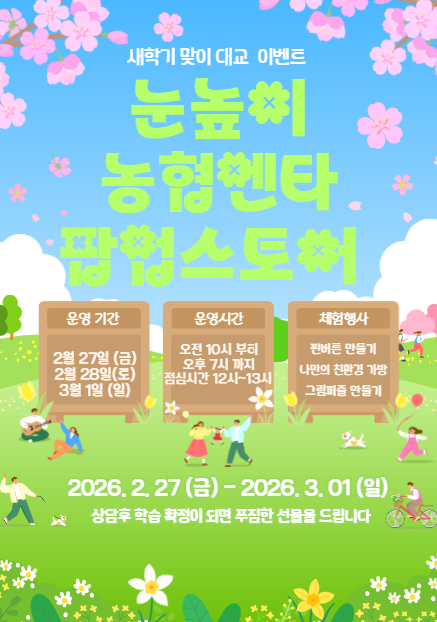 안녕하세요~~:) 눈높이 한숲시티 공부방입니다. 새학년 새출발을 앞둔 3월! 눈높이에서 새학기 맞이 빅이벤트를 준비했어요^^ 농협 엔타에서 다시 한번 팝업스토어를 오픈합니다~ 지난달 팝업 행사에 뜨거운 관심 가져주셔서 다시한번 돌아왔습니다~~ !! 농협 엔타로 와서 재미있는 체험 활동도 즐기고 우수 도서도 받고 뽑기도 하고 행운의 선물을 받아가도록 해요^^ 농협 엔타 1층 이벤트 장소에와서 상담후 학습확정이 되면 푸짐한 선물을 드립니다!! 기간: 2월 27일(금) ~ 3월 1일(토) 시간: 10시 ~ 7시 학습상담 받고 푸짐한 선물 받아가세요^^ 5과목 입회시 (택1) 3과목이상 입회시 1과목이상 입회시 많은 관심과 참여 부탁드립니다 :) 기....... <img src="https://blogthumb.pstatic.net/MjAyNjAyMjBfMjcz/MDAxNzcxNTYyNDE5MjM0.BeeWr_3AT5_X0fSeZG30LcSH1Qbe2z82PxfAT5LFNf8g.9O2edCHbzUT86EZitG_NeZ4U-NRbWb90Ffbw9rTYVowg.PNG/%C8%AD%B8%E9_%C4%B8%C3%B3_2026-02-20_133641.png?type=s3" />