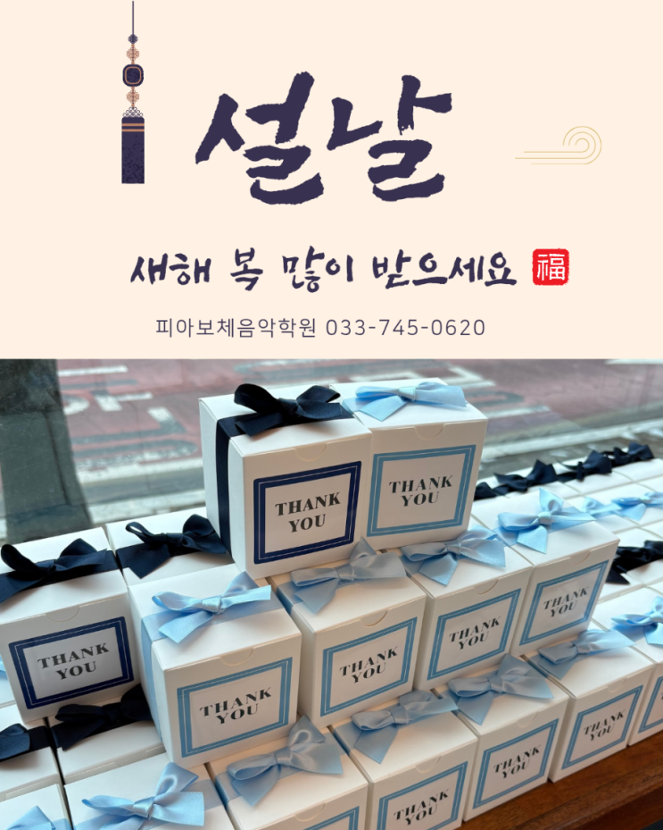 우리 피아보체 부모님들께 설날 맞이 작은 마음을 전달합니다!! 오늘부터 금요일까지 아이들 편에 보내드리겠습니다 미리 새해 복 많이 받으세요^^ ✨️피아보체음악학원 033-745-0620✨️ #무실동피아노학원 #피아보체음악학원 #무실초건너편 #원주피아노학원 #설날 #미리설날 #감사합니다 <img src="https://blogthumb.pstatic.net/MjAyNjAyMTFfMzgg/MDAxNzcwODE2ODcyOTEx.6f9ososEIlhsbl2Df4i0h4IOQkUhU1pLvIMxg4KZOAQg.ee3_nC6LqXogQC3pnBfIPUSHJPxcXUhcNg9aQK8DxUwg.PNG/900%A3%DF%C3%CA%B7%CF%BB%F6_%BA%A3%C0%CC%C1%F6%BB%F6_%BB%F5%C7%D8_%BC%B3%B3%AF_%C0%CE%BB%E7_%C0%CE%BD%BA%C5%B8%B1%D7%B7%A5_%C6%F7%BD%BA%C6%AE%A3%DF20260211%A3%DF191315%A3%DF0000.png?type=s3" />