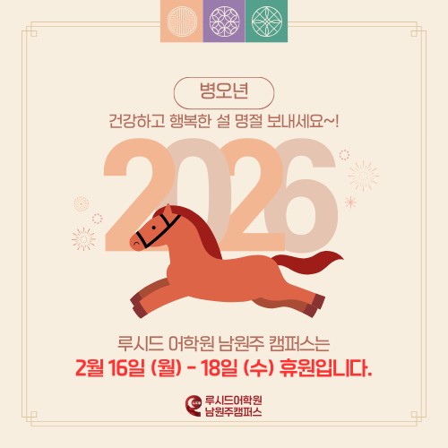 안녕하세요~! 단구동 영어학원, 루시드어학원 남원주 캠퍼스입니다. 즐거운 설 명절이 다가왔습니다. 설 연휴에는 사랑하는 가족들과 맛있는 음식 나누며 편안하고 따뜻한 시간 보내시길 바랍니다~^^ 설 연휴 휴원 : 2월 16일(월) - 18(수) 2026년에는 루시드어학원 남원주캠퍼스도 아이들과 함께 한 걸음 더 도전하고, 스스로 해낼 수 있는 힘을 키워가는 한 해로 만들어가겠습니다. 조급하게 앞서가기보다, 자신감 있게 나아갈 수 있도록 옆에서 돕겠습니다. 새로운 한 해에도 가정마다 건강과 평안이 가득하시고, 새해 복 많이 받으세요~^^ #단구동영어학원 #단구동초등영어 #단구동중등영어 #단구동고등영어 <img src="https://blogthumb.pstatic.net/MjAyNjAyMTVfMjI0/MDAxNzcxMTQ4NjUwNjA5.9K0_q1O-bYOuiiWhm4KXMqARzW7NuqsUqTwLsQHch8Ug.uTQ_2pBdTfPTP3Ftkx5b6qCphpUU-YHpIMmcVvYcgIgg.PNG/3.png?type=s3" />