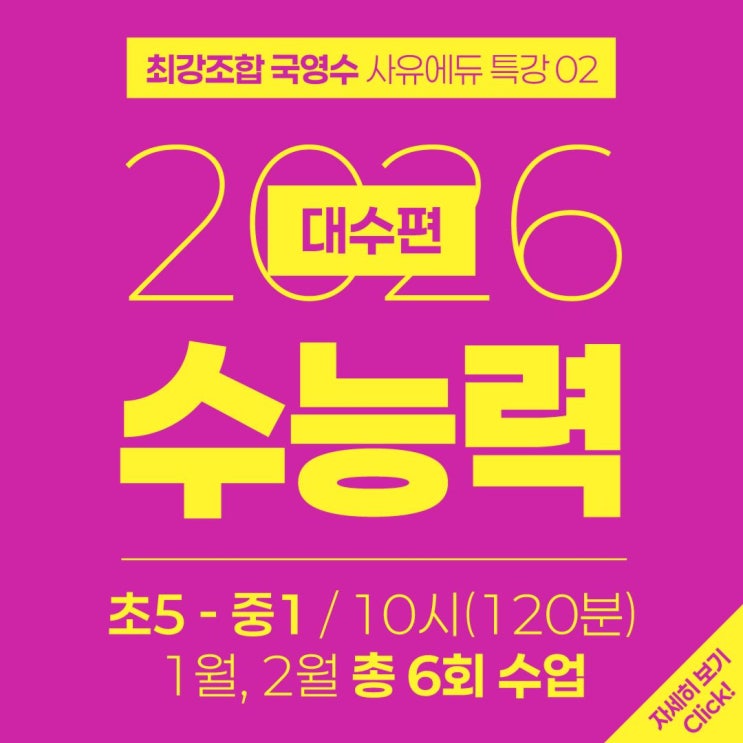 안녕하세요. 사유에듀 학원입니다. 어느덧 2026년의 시작, 우리 아이들의 겨울방학이 시작되었습니다. 이번 겨울, 우리 아이의 수학 공부는 어디를 향하고 있나요? 단순히 문제집을 몇 권 풀었느냐보다 중요한 것은 '수학의 맥락을 이해하고 있는가'입니다. 오늘은 예비 초5부터 예비 중1 학생들을 위해 준비한 아주 특별한 강의, 민보미 원장님의 <수능력 : 대수편> 특강을 소개합니다. 수학의 허리, '대수(Algebra)'를 잡아야 수능이 보입니다. 많은 학부모님께서 기하(도형)는 잘 아시지만, '대수'라는 말은 조금 어렵게 느끼시곤 합니다. 하지만 대수는 수학의 '허리'이자 가장 핵심이 되는 영....... <img src="https://blogthumb.pstatic.net/MjAyNjAxMDhfMjQx/MDAxNzY3ODQ0NTQxNTY0.Yg4XYtpmSfvqVO8W546w9GvHKxJtvWYP9kleaKJxkR8g.vJFV1br-nL3VY3qj9TjO7WtO2s9VR4zqBzy3BTCJGukg.JPEG/6.jpg?type=s3" />