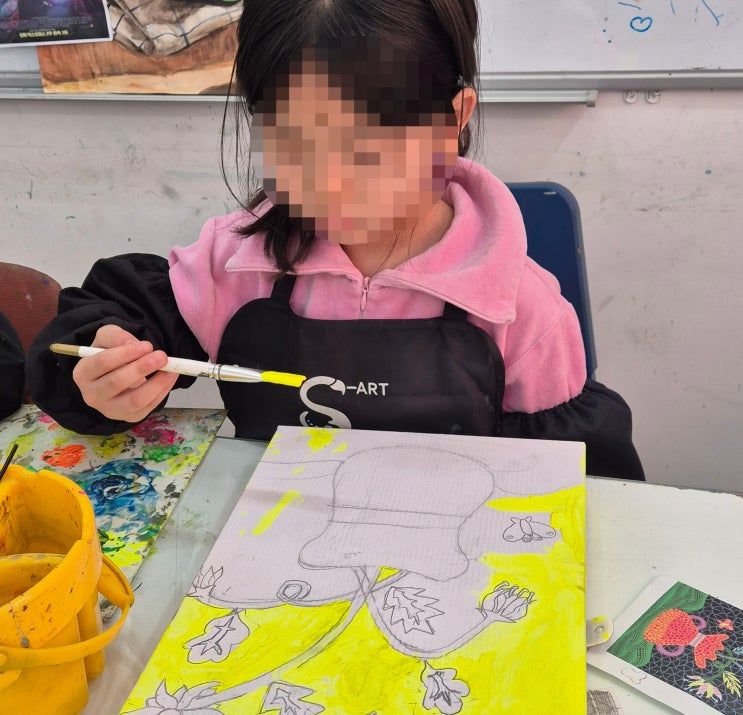 안녕하세요~! 에스아트미술학원입니다 오늘은 쿠사마야요이 수업을 소개해보려고 해요 이번 수업에서는 일본의 현대미술 작가 쿠사마 야요이의 작품을 모티브로 작업해보았어요. 쿠사마 야요이는 ‘점'을 활용한 독특한 작품으로 유명하죠! 반복되는 점과 강렬한 색감이 특징이라 아이들도 재미있게 접근할 수 있는 작가예요. 원하는 사물이나 풍경을 물감을 사용해 예쁘게 칠해준 후에, 쿠사마 야요이처럼 크고 작은 점을 찍어주어 그림을 완성해주는 시간이었어요. 아이들이 어떻게 그려냈는지 한번 볼까요? 스케치가 된 그림에 먼저 물감으로 채색을 해주고! 마카로 점을 찍어 꾸며주면~ 짠~ 너무 멋지게 완성됐죠? 다른 친구들의 작품들....... <img src="https://blogthumb.pstatic.net/MjAyNjAyMjZfMjM2/MDAxNzcyMDg3ODE1NTY0.ZgmUVp-ki59N2BgL01pcxWHnhCuAlcJeI_4lDQLT_ZMg.wB1VpUpLVE89bTbg6l1bLII0zlpjsR49BamCjnaD1vsg.JPEG/KakaoTalk_20250323_212317163_01.jpg?type=s3" />