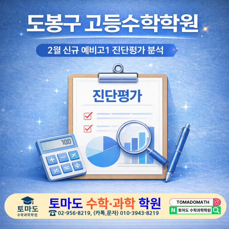 고등학교 입학을 앞둔 예비고1 시기는 단순히 “선행을 시작하는 시기”가 아니라, 중학교 과정의 이해 상태를 정확히 점검하고 고등수학으로 연결될 기초를 다지는 시기입니다. 도봉구 고등수학학원 토마도 수학과학학원에서는 2월 신규 예비고1 학생을 대상으로 진단평가를 진행하고, 그 결과를 바탕으로 개별 맞춤 커리큘럼을 설계하고 있습니다. 이번에 소개할 사례는 진단평가 공통수학1-1(중3 다항식 단원) 진단 결과를 바탕으로 한 분석입니다. 1. 현재 점수보다 중요한 것은 “구성” 해당 학생의 진단평가 총점은 **48점(100점 환산 기준)**이며, 25문항 중 12문항을 맞힌 상태입니다. 이 수치만 보면 낮다고 느껴질 수 있지만, 더 중요....... <img src="https://blogthumb.pstatic.net/MjAyNjAyMDFfMTk4/MDAxNzY5OTQ2MDM1OTgw.TXS9JrdcJH0C9VDB_Nsx8MVzN67Z8o1qr_WU9HoP8Owg.0N_su-x5F4AFD1N9v5spjjsFYnlFMrG5cvTx-metsZ4g.PNG/%C1%A6%B8%F1%C0%BB_%C0%D4%B7%C2%C7%D8%C1%D6%BC%BC%BF%E4..png?type=s3" />