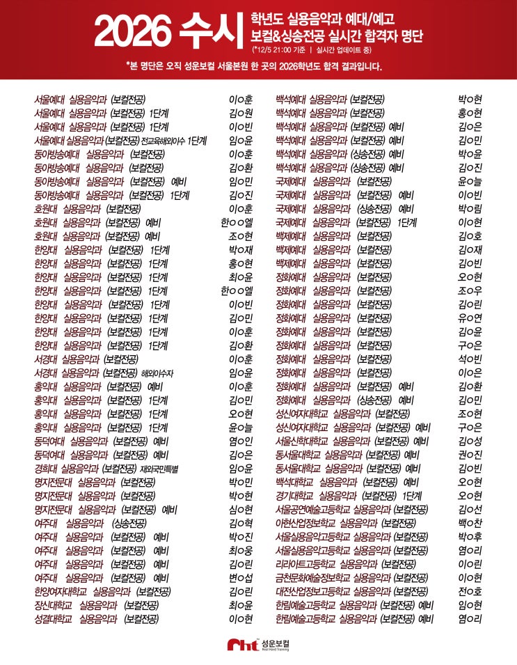 안녕하세요! 성운보컬 아카데미입니다! 2026학년도 실용음악과 예대/예고 수시 보컬 &싱송전공 실시간 합격자 명단을 들고 왔습니다 ! 모두모두 정말 축하해요 ! 아 참 합격자 명단은 실시간 업데이트 중인 점 참고 부탁드리며, 합격하신 우리 제자님들께 큰 박수 부탁드리겠습니다 ✔서울 본원 1개의 지점만의 결과 ❗ ✔수고많았어요! 앞으로 여러분들의 꿈을 응원합니다! 더 큰 세상에서, 각자의 목소리로, 다양한 메세지를 담아 표현하는 사람이 되기를. 멀리서 응원할게요 제자님들! 정시(4년제) 보컬전공 모집요강 바로가기 정시(2년제, 3년제(2,3년제) 보컬전공 모집요강 바로가기 정시 싱어송....... <img src="https://blogthumb.pstatic.net/MjAyNTEyMDZfMjUy/MDAxNzY1MDA1NzE1MTg3.r4qTwiOLAr3YtbDClZ6UGkq-d6dfkTq11-wqhelhto4g.wVbd4KariUO5GZjLjUaiXbdah6PU7rzjaYsRRVHpR04g.JPEG/%BC%F6%BD%C3%C7%D5%B0%DD%C0%DA%C3%D6%BD%C5%C8%AD_251206.jpg?type=s3" />