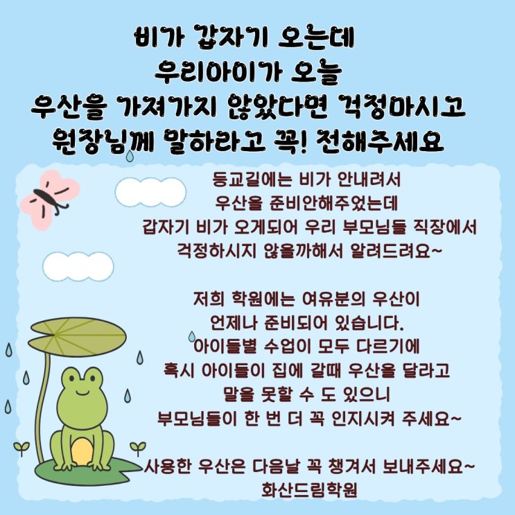 비가 오는데 우리 아이가 우산을 가지고 가지 않았다면? 화산드림영수학원은 걱정하지마세요