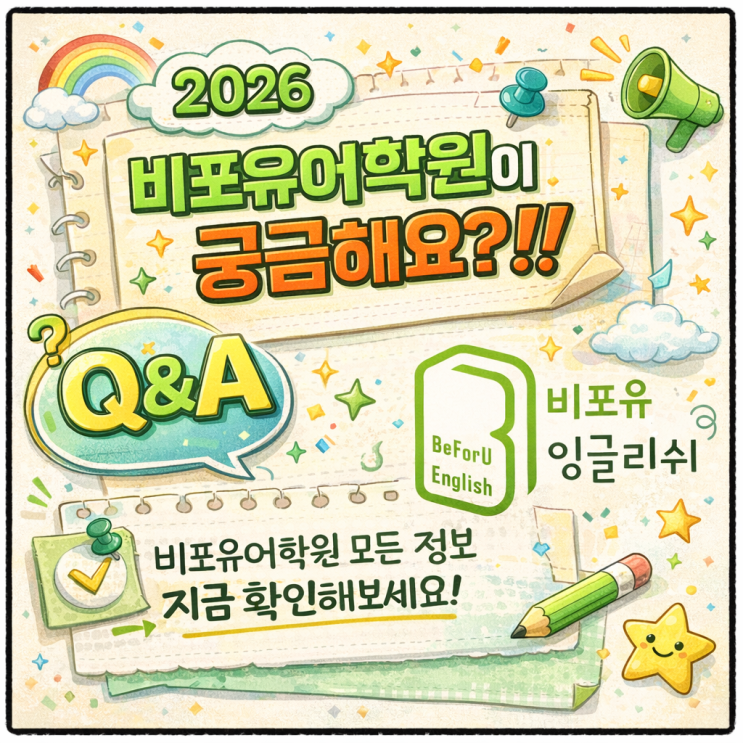 비포유어학원 2026년 Q&A Q. 비포유어학원은 몇 살부터 수업이 가능한가요? A. 비포유어학원은 6세부터 중학교 3학년까지 영어수업을 하고있습니다. 비포유어학원을 유치부·초등 저학년 중심 학원으로 생각하시는 분들이 많지만, 저희는 초등 전 학년은 물론 중학교 3학년까지 책임지는 영어 전문 학원입니다. 특히 초등 고학년 → 중등 영어로 자연스럽게 연결되는 커리큘럼이 비포유의 가장 큰 강점입니다. 2025학년도 중학교 1·2차 지필고사에서 대부분 고득점을 기록하며, 또한 하위권 친구들은 20~40점이상 상승하였습니다. 학생들의 노력한 만큼의 결실이겠죠~^^* Q. 수업 시간은 어떻게 되나요? A. 연령별·과정별로 가장 집중도....... <img src="https://blogthumb.pstatic.net/MjAyNjAxMDdfMjAy/MDAxNzY3NzcxMDQ5Njk3.dZXFezL2YumF0mAFdQGFJ_jLJFJRBdG-ZHmuqBpQeQsg.XO1XG5bS-UlnXNHJK6H1eT9TXMJGglZflE0RcCQGpzwg.PNG/ChatGPT_Image_2026%B3%E2_1%BF%F9_7%C0%CF_%BF%C0%C8%C4_04_22_42.png?type=s3" />