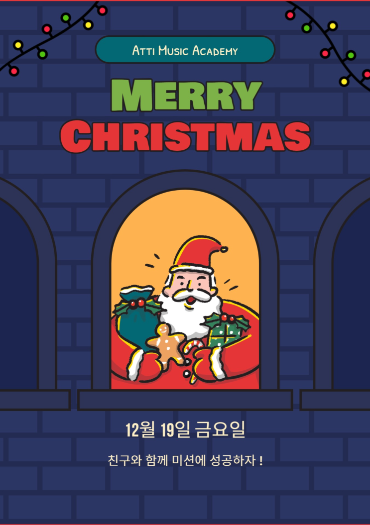 – 12월 음악 특강 이야기 – 12월을 맞아 아띠음악학원에서는 아이들이 음악을 더 재미있게 경험할 수 있도록 「산타의 크리스마스 방탈출 미션」 음악 특강을 진행했습니다 수업 시작 전, 산타 할아버지의 편지를 받은 아이들은 사라진 크리스마스 간식을 되찾기 위해 크리스마스 음악 탐정단으로 변신! ️♂️ 이번 특강은 총 4개의 방으로 구성된 음악 방탈출 활동으로, 각 방마다 다른 음악 미션을 해결하며 자연스럽게 집중력과 협동심, 음악 개념을 익힐 수 있도록 준비했어요. 1번 방 : 크리스마스 퍼즐 방 흩어진 퍼즐을 하나씩 맞추면 도둑이 남긴 첫 번째 단서가 등장! 아이들은 서로 역할을 나누고 차분하게 협....... <img src="https://blogthumb.pstatic.net/MjAyNTEyMzBfMjU0/MDAxNzY3MDcyNDkxNzA3.1QM-5oHDEzXNo2Dfh4DO378klq92QEUUOtXKYq6pA6Yg.ePkVd8Tw5q1kTeKU3YxAmPYYOce4Gxk0pbhBX-oOQfAg.PNG/54426777_1765271075253.png?type=s3" />