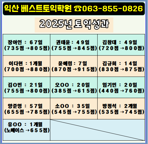 [익산토익학원] 베스트토익 2025년 점수결과 모음 및 문장 구조 분석 베스트토익과 함께하면 그동안 오르지 않았던 토익점수가 탄탄한 기본기를 토대로 수직 상승하게 됩니다. 베스트토익은 1월 8일 오늘 개강 했고, 제대로된 기본기부터 배우는 기회를 마련하였습니다. 토익공부를 해도 점수가 오르지 않는 이유는, 기본기가 없거나, 잘못 알고 있거나, 대충 알고 있기 때문입니다. 어떤 분야이던 기본이 튼튼해야 잘 되는 법입니다. 그런 기본기를 암기가 아닌, 이해와 설득으로 가르치는 익산토익학원은 베스트토익뿐입니다. 그래서 결과가 항상 잘 나오고 있고, 최근까지도 성과가 잘 나오고 있으며, 그로 인해 우리 학생들의 수강후기들을 소....... <img src="https://blogthumb.pstatic.net/MjAyNjAxMDhfOSAg/MDAxNzY3ODc1MjM2ODA2.neRmRYIOhwN8D6k4iq39CF6yxRgu9TVWTKwA9hxpDLwg.OMRWoxfMLqYtH37OdXDnVyXT3CWHUXs9BDmSCmyGwjQg.PNG/ss.png?type=s3" />