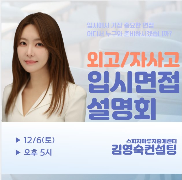 스피치마루지중계김영숙컨설팅의 2025 외고 자사고 50명 합격의 비결! 대일외고 서울외고 하나고 선덕고 이화여고 이화외고 용인외대부고 상산고 민사고 안녕하세요, 김영숙컨설팅입니다^^ 2026학년도 외고·자사고 입시는 학업 성적뿐 아니라 면접 평가의 비중이 높아지고 있습니다. 특히 대일외고·서울외고·이화외고와 같은 외고, 그리고 하나고·용인외대부고·상산고·민사고 같은 자사고는 사고력·지원동기·경험의 진정성·태도까지 꼼꼼하게 살펴봅니다. 따라서 외고 자사고 면접 준비는 전형 분석 + 답변 구조화 + 매너 관리가 함께 이루어져야 합니다. 아래는 외고·자사고 면접에서 점수를 높이는 핵심 요소 3가지입니다. [입시설명회 신청폼....... <img src="https://blogthumb.pstatic.net/MjAyNTEyMDZfMTMx/MDAxNzY0OTkxOTgzODkz.3ziD88FqPIgSGj73jPoaZjvln5fMOJDGwI1cJyRtz1cg.g2VecArC8QPryB3eyOyErr7Gn0I3zEdLOPVBX8k39gUg.JPEG/%C8%AD%B8%E9_%C4%B8%C3%B3_2025-12-06_123245.jpg?type=s3" />