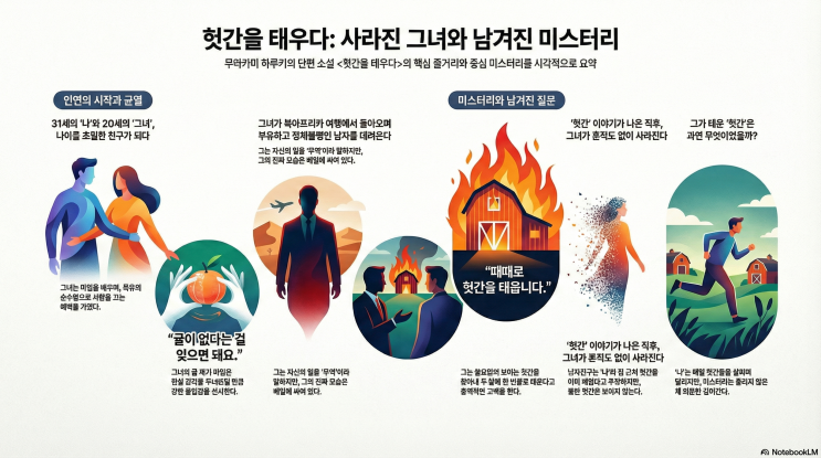 <<헛간을 태우다: 사라진 그녀와 남겨진 미스터리 >> 헛간을 태우다_무라카미 하루키 이 소설은 무료한 일상을 보내는 소설가인 주인공이 묘한 매력을 지닌 한 여성과 그녀의 신비로운 남자친구를 만나며 겪는 기묘한 심리적 미스터리를 다루고 있습니다. 이야기는 실체가 없는 귤을 까먹는 팬터마임처럼 존재와 비존재의 경계가 모호한 분위기 속에서 전개되며, 남자가 고백한 헛간을 태우는 비밀스러운 취미는 평온한 일상 이면에 숨겨진 파괴적인 욕망을 암시합니다. 주인공은 주변의 헛간들을 살피며 남자가 예고한 방화를 추적하지만, 정작 헛간은 타지 않은 채 여성의 갑작스러운 실종이라는 더 큰 공허함에 직면하게 됩니다. ....... <img src="https://blogthumb.pstatic.net/MjAyNjAxMTFfMjEg/MDAxNzY4MTA0NzA5NjMw.wtDTeIcGfox_yrYbqWPGr7pNQaYUFcO9ML1AvqudKxIg.mJCIrlvKAoPNzt2Ymtgu3hGGmBwPCgLGlyhi3J-8Gdog.PNG/unnamed.png?type=s3" />