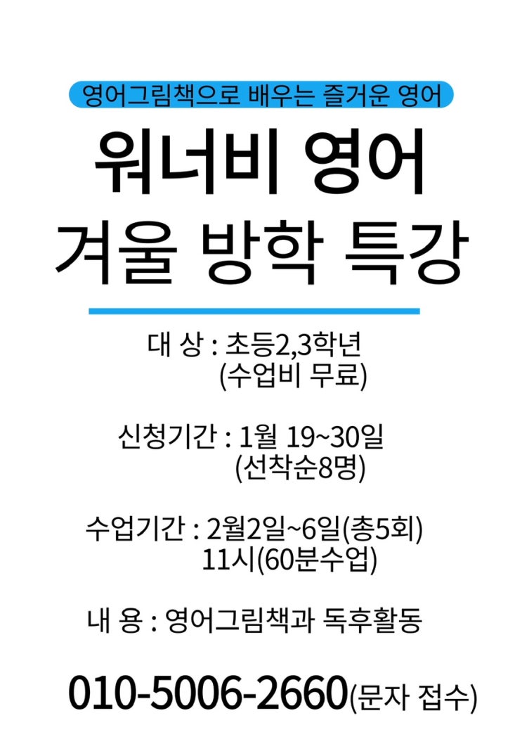 2026년 워너비 겨울 방학 특강을 앞두고 있습니다. 수업 시작 2월 2일~6일(총5회) 오전 11시 초등2,3학년을 대상으로 영어 그림책을 처음 접하거나 관심있는 친구들을 대상으로 수업이 진행됩니다. 매일 하루 1권의 영어 그림책을 읽고, 재미있는 독후 활동을 함께 합니다. 선착순으로 총 8명의 학생들과 함께하며, 수업비는 무료입니다. 총 5회의 시간동안 성실히 수업 참여할 학생들을 모집하고 있습니다. 수업 신청은 문자로 부탁드리며, 학생 이름, 학년, 학교로 신청 해주시면 됩니다. ^^ <img src="https://blogthumb.pstatic.net/MjAyNjAxMTlfMjI3/MDAxNzY4ODAyMDMzNDM2.5MmSs9xzBQYpOWonuvdP45miyonZcF8zj6Mz1_v_5D0g.qbldo5zryiyUE6zqtFKzUGSsiu-B6L533ojYMTm61sEg.JPEG/IMG%A3%DF8722.JPG?type=s3" />