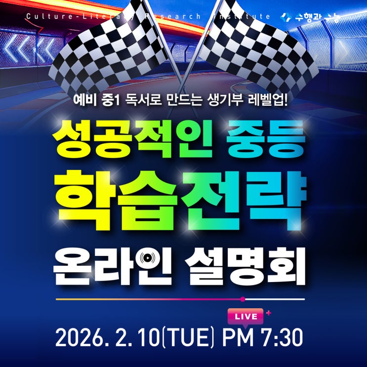 안녕하세요, 수행과 수능입니다. 중학교에서는 독서를 기반한 사고력·표현력 교육이 강화되고, 수행평가·서술형·학교생활기록부 관리, 고교학점제에 대한 준비가 필요합니다. 이번 설명회를 통해 올바른 학습방향 및 학습전략을 세워 우리 아이의 성공적인 중등 생활을 이끌어가시기를 바랍니다. 좋은 생기부는 올바른 독서에서 시작됩니다. 주제: 성공적인 중등 학습전략 일시: 2월 10일(화요일) PM 7:30 신청 방법: https://forms.gle/maMvqnZKyVSYYLsNA (신청자에 한해 줌 계정 설명회 당일 문자 발송 예정) ▲ 온라인 설명회 사전 예약하기 ▲ 대치점 > 02-599-9968 잠실점 > 02-555-9968 서초점 > 02-595-9968 분당점 > 031-713....... <img src="https://blogthumb.pstatic.net/MjAyNjAxMjZfMjkw/MDAxNzY5Mzk4MDk3NTQ2.7glmOf-fT9ZcfDvNFkjsj118BNlXOyGABo-m-HfYKDAg.fi_2tWhX0u9vDMqeojYfurYxrTZ4UerOTee8gx55V9gg.JPEG/26-%BC%F6%C7%E0%B0%FA-%BC%F6%C1%F5-%BA%ED%B7%CE%B1%D7-%BD%E6%B3%D7%C0%CF-1080-%BC%B3%B8%ED%C8%B81.jpg?type=s3" />