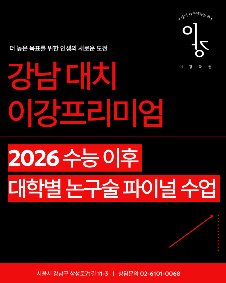 안녕하세요 대치동 재수 종합학원 이강 프리미엄 입니다. 오늘은 긴 여정의 끝자락, 수능 전날입니다. 그동안 묵묵히 함께 고생해온 수험생분들과 학부모님 모두에게 깊은 응원과 감사의 마음을 전합니다. 수험생 여러분, 지금까지 쌓아온 시간과 노력이 여러분의 가장 큰 힘입니다. 오늘 하루는 새로운 것을 더하기보다, 그동안 익힌 것을 점검하며 마음을 안정시키는 시간으로 보내세요. 2026 수능이 끝났다고 여정이 끝난 것은 아닙니다. 진짜 결과를 결정짓는 마지막 무대, 대학별 논·구술 파이널이 시작됩니다. 강남 재수종합학원 대치 이강프리미엄은 재수·반수·N수생 모두를 위해 대학별 출제 경향에 완벽히 맞춘 논·구술 파이널 개강 시....... <img src="https://blogthumb.pstatic.net/MjAyNTExMTJfNDEg/MDAxNzYyOTEzMjkwMTA1.RlaRVRbp5PPz0kvvmwnavAzkEd1lv4S8L6LHnKx0m7Ug.SqG7pa5FoXogQMXCIk9dWOPILrGEUFzUHY8dBaCiL0Ag.PNG/%C1%A6%B8%F1%C0%BB_%C0%D4%B7%C2%C7%D8%C1%D6%BC%BC%BF%E4._%288%29.png?type=s3" />