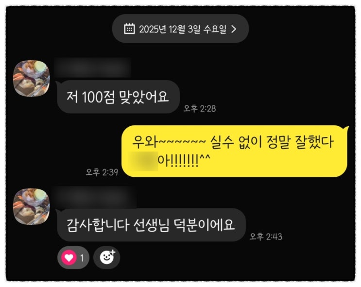 100점 보다 더 기분 좋은 말. 그건 바로. 감사합니다 선생님 덕분이에요 이제 한 학교 시험이 끝났습니다. 시험 후 바로 답지를 받아 채점까지 했다고 하네요. 시험이 끝나면 시험 결과들을 블로그에 올리곤 했었는데 어느 순간 무의미하다 생각되어 올리지 않았습니다만 오늘 학생에게 문자를 받고 마음이 너무 따뜻해져서 블로그에 올려보고 싶었습니다. 이런 맛에 학원하는거 아니겠습니까!!!ㅎㅎ 말도 이쁘게 하는 울 남학생^^ (시험이 서술형에 논술형까지 더해져서 갈수록 100점 맞기도 힘든 상황에 기특하게 실수도 하지 않고 잘 이겨낸 너가 더 감사하다!!!^^) <img src="https://blogthumb.pstatic.net/MjAyNTEyMDNfNzAg/MDAxNzY0NzQxNjE4NTgx.tYcFMnDgHF3a0duvFO4YGUOynfP68VGufFoZeAcomqcg.sDHZbLX7HVWbUWFFOOvDi81iVgDMzhVXqbeO2jxWPiog.JPEG/900%A3%DFAISelect%A3%DF20251203%A3%DF144745%A3%DFKakaoTalk.jpg?type=s3" />