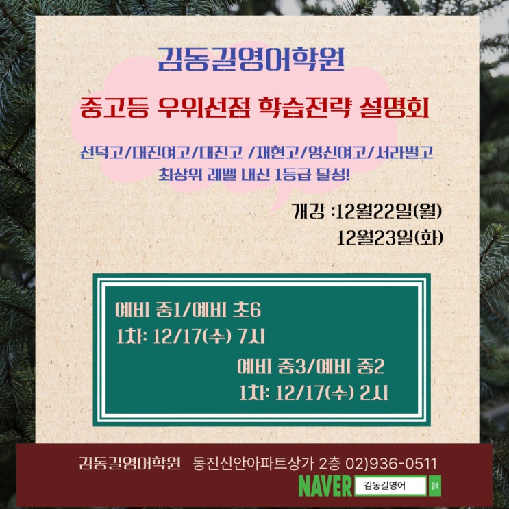 설명회 일정 안내드립니다. 1차: 12월 17일(수) 2차: 12월 19일(금) 3차: 12월 20일(토) 자세한 시간은 아래표를 참고해주세요. 설명회 예약 꼬옥 부탁드립니다. 김동길영어☎ 02) 936-0511 문자예약가능도 가능합니다. 문자예약시 학생명/학교학년/참석일, 시간 알려주세요. 많은 관심과 참석부탁드립니다. ★ 설명회 일정 안내 ★ #선덕고 #대진고 #대진여고 #영신여고 #재현고 #서라벌고 #중계동영어학원 #은사영어학원 태그 <img src="https://blogthumb.pstatic.net/MjAyNTEyMTBfODQg/MDAxNzY1MzU4NTc5Nzg3.T4VHJLU81FdKa-dlw9Ck1d7Fa77YX6q-6Ydb8MBmEIog.vAQnHYQGzKmj5LdHButYFt9CpgxCQvY2MBYMRQOJaWYg.JPEG/%BC%B3%B8%ED%C8%B8%C0%CF%C1%A4-202512_%C3%D6%C1%BE.jpg?type=s3" />