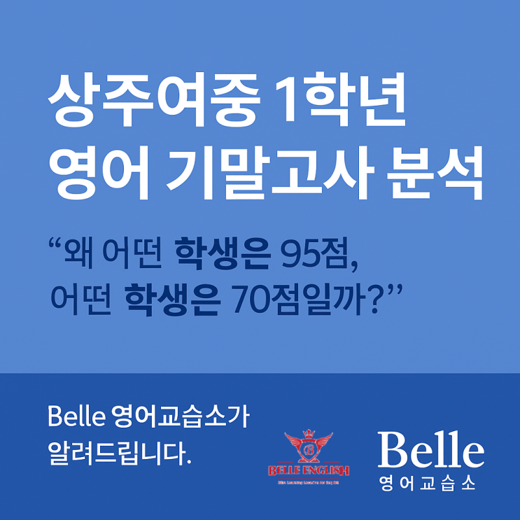 안녕하세요! 영어 배우기 가장 좋은 곳 BEst Learning Location for English 벨 영어입니다. 요며칠 학원 자동문이 스르르 열리면 선생님! 하고 부르는 톡이 오면 몸은 자동반사입니다. 시험 후기에 귀가 쫑긋입니다^^ 어제도 시험 끝나고 하교하는 길에 들른 친구랑 그 자리에서 선채로 시험지 얘기를 한참 하다가 헤어졌습니다. (다음에 등원하면 다시 얘기하자~^^) 오늘은 상주여중1학년 기말고사 시험지 분석입니다. 이번 시험은 총 25문항 / 100점으로 구성되어 있으며, 전범위 교과서에서 출제되었으며 평균배점은 4점입니다. 문항 유형은 9가지로 종합적 독해력과 어법 적용력을 평가했습니다. 출제 범위는 7과는 48%, 8과는 52%로 범위는....... <img src="https://blogthumb.pstatic.net/MjAyNTEyMTFfMTQg/MDAxNzY1MzgwNTQ0NjA4.nQcXz-XB6ZxQ5JyNU7rK3zdP8ZWz53Ng96Ca5ZC3cNAg.08V63e1uWjx2-ALzELuAFGswYK9H2Z3GFtSkPHL_12Mg.PNG/%BA%A7%B7%CE%B0%ED_2025%B3%E2_12%BF%F9_11%C0%CF_%BF%C0%C0%FC_12_02_09.png?type=s3" />