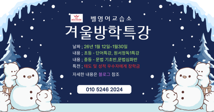 안녕하세요! 영어 배우기 가장 좋은 곳 BEst Learning Location for English 벨 영어입니다. 오늘은 겨울방학동안 진행될 방학특강에 대헤서 말씀드리겠습니다. 벨영어에선 방학때면 특강을 진행해오고 있습니다. 초등의 경우 파닉스가 들어있는 원서 입문반으로 시작후 사이트워드가 끝나갈 즈음 방학에 다독특강을 합니다. 원서 600권을 종이책으로 e-book으로 하루 총 40권을 3주 동안 읽는 과정입니다. 벨영어에 입회 후 딱 한번만 들을 수 있는 과정입니다. (이 특강 후의 성취감과 자신감은 정말 최고조인듯합니다.) 여름 방학때 다독특강을 한 친구들은 겨울 방학때 단어 1특강을 실시합니다. 600개의 단어를 학습하는 과정입니다. 각 주....... <img src="https://blogthumb.pstatic.net/MjAyNTEyMjlfMjYy/MDAxNzY2OTc5MjM1NjM3.Ya61yxLj2UiF7aIqOi77BCTiW4dg7nYnueLpyCKYH0Mg.pr0Ib6SSW26sC6ZZN4XWnpId3SLfgTp0oOaJQn6oEQkg.PNG/2025%B0%DC%BF%EF%B9%E6%C7%D0%C6%AF%B0%AD.png?type=s3" />