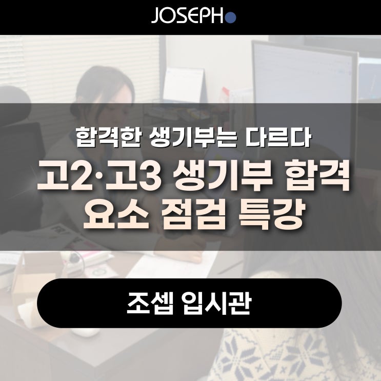2026학년도 대비 무료 생기부 특강 후기 고2·고3, 지금은 생기부가 입시를 결정합니다 예비 고2·고3 생기부 합격 요소 점검 특강 진행 조셉학원 입시관에서 조셉 입시선생님 김지원T가 직접 진행한 2026학년도 대비 예비 고2·고3 대상 무료 생기부 합격 요소 점검 특강을 진행하였습ㄴ다. 이번 특강은 단순한 생기부 작성 요령을 넘어, “왜 같은 성적에서도 합격과 불합격이 갈리는가”라는 질문에서 출발해 최근 입시 환경 변화와 실제 합격 사례를 바탕으로 지금 학생들이 반드시 점검해야 할 생기부 관리의 방향을 짚는 데 초점을 맞췄습니다. 김지원T는 최근 수능 난이도 변화와 정시·수시 구조를 분석하며, 수능이 쉬워졌다고 해서 입시가....... <img src="https://blogthumb.pstatic.net/MjAyNjAxMjhfMTI0/MDAxNzY5NTkxOTIxMTk5.cEEA2JC1woudthE6mlE4INzisV0c21wbPZOdIFLwQYIg.nALt_fzJpLErmLauz6-DkXf7C-2ukFp-EG2ZxfC-ZVcg.JPEG/2026%BC%F6%B4%C9%BA%D0%BC%AE-%C0%D4%BD%C3%BA%ED%B7%CE%B1%D7-003.jpg?type=s3" />