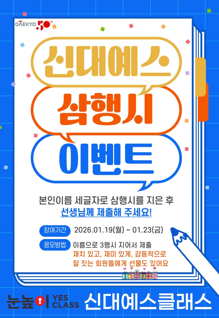 안녕하세요 눈높이 대구시지 Hive 입니다 오늘은 신대예스클래스 공부방 소식을 전해 드리려고해요 1. 재미있는 삼행시 짓기 이벤트 신대 예스클래스 친구들이 참가해서 본인 이름으로 재치있고 , 재미있는 삼행시 짓기를 해봤어요!! 잘 작성한 친구들은 상장이랑 상품도 받았고요~ 1월에는 모든 친구들이 계산력 평가도 실시 했어요 모든 친구들 진지하게 시험에 임하고 있어요 계산력 평가란? 연산 공부를 열심히하고 있는 친구들 계산 실력이 얼마나 늘었나 실력+학년에 맞는 계산력 평가를 주기적으로 실시하고 시험을 통해서 실력을 확인하는 평가 입니다. 26년에도 열심히 공부하는 신대예스클래스 친구들 올해도 화이팅~ <img src="https://blogthumb.pstatic.net/MjAyNjAxMjhfMTI3/MDAxNzY5NTc4NTQ4NTMz.lO6xXRYoFVFTKsFIHs0_rKw5HjewpZH5FxZD1Jor7gwg.ZNz16ORNAQuvoZwIxSm65u6vcN9LMNAfFzlgyn0QwUgg.JPEG/%C1%A6%B8%F1%C0%BB_%C0%D4%B7%C2%C7%D8%C1%D6%BC%BC%BF%E4._%2819%29.jpg?type=s3" />