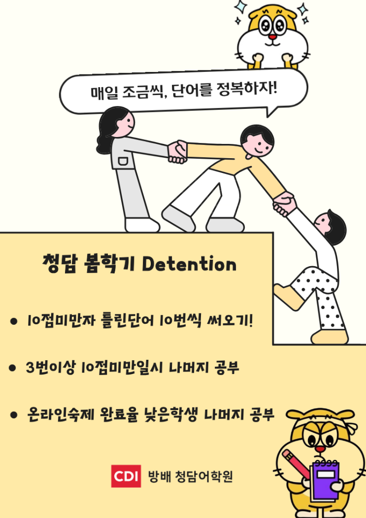안녕하세요:) 방배청담어학원 입니다 봄이 오고, 학년이 올라가는 만큼 영어의 제일 기본! 단어공부를 독려하기 위한 청담 Detention 을 시행합니다 3번이상 10점미만일시 1시간정도의 Detention 이 진행될 예정이니 매일 보는 단어 test에서 좋은 성적을 거둘수 있도록 열심히! 함께 노력해보아요! *매주 온라인 완료율도 체크하니 힘내서 숙제도 잘 완료해올수 있도록 가정에서도 함께 도움 부탁드립니다 감사합니다. <img src="https://blogthumb.pstatic.net/MjAyNjAzMTNfMjM1/MDAxNzczMzk4ODczMDA5.-WLkgowY-tV1D9jjjDFM1GQ6YyWxZ04FJF1HZtqu5msg.p02wNPPjbFFJN36Px2fnbxhPtLfLH-alh2BiOHJYsKMg.PNG/%C1%A6%B8%F1%C0%BB_%C0%D4%B7%C2%C7%D8%C1%D6%BC%BC%BF%E4..png?type=s3" />
