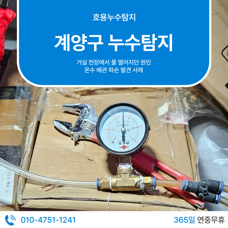 계양구 누수탐지 거실 천장에서 물 떨어지던 원인 온수 배관 파손 발견 사례