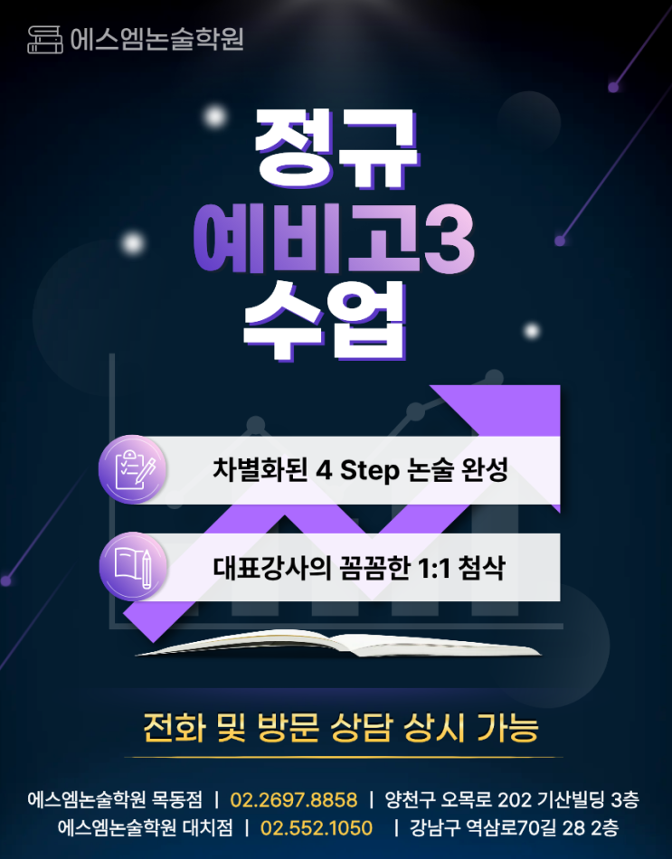 대입 제도가 새롭게 개편되기 전, 기존 대입 제도로는 27학년도가 마지막이 되기 때문에, 올해의 입시는 그리 호락호락하지 않을 것입니다. 그리하여 2027학년도 수능·논술 대비, 바로 지금부터 시작해야 합니다!! 예비 고3이 되는 이번 겨울방학은 논술 기초를 틀 제대로 다지기 위한 골든타임입니다. 지금부터 체계적인 커리큘럼을 통해 기본기를 잘 다지는 것이 매우 중요합니다! 올해 상반기를 얼마나 알차게 잘 준비하느냐에 따라 후반기에 여러분의 선택지가 많아질 것입니다! 저희 에스엠 논술학원은 인문논술, 수리논술, 약술형 논술까지 4Step 논술 완성 시스템(입문 → 탐색 → 실전 → 평가)을 기반으로 기초부터 대학별 실전 대....... <img src="https://blogthumb.pstatic.net/MjAyNjAxMDVfNjcg/MDAxNzY3NjExMTk5NTEx.yfhO2v_esMhaBMumvyAEZQdBySJ_QpAk3xq2seNLNd4g.A5RS--CIkhRWoWXGREi44AnNfEgNQZZlPfMIeAs9bSIg.PNG/%BF%B9%BA%F1%B0%ED3_%C8%AB%BA%B8_3_%B3%AF%C2%A5%C1%A6%B0%C5.png?type=s3" />