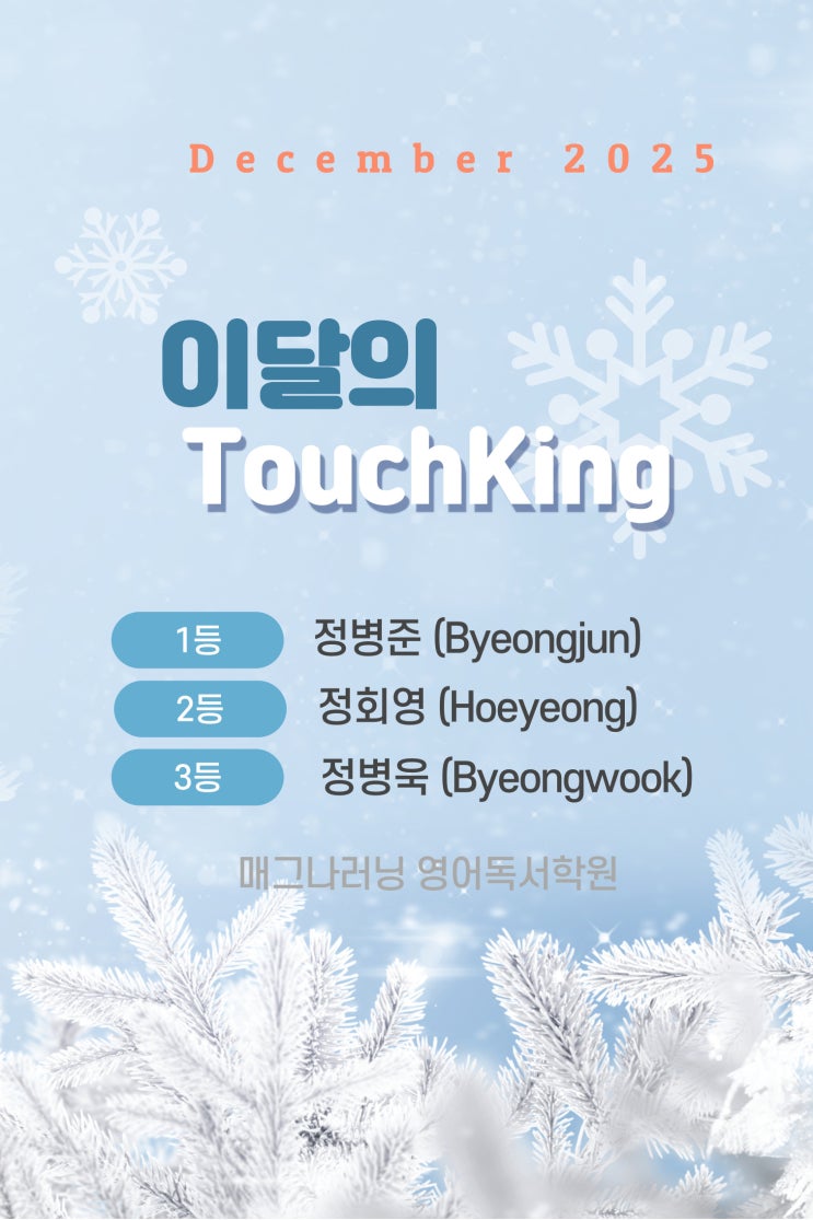 안녕하세요? 대치동 No.1 영어도서관 매그나러닝 영어독서학원입니다. 이달의 Touch King으로 뽑힌 세 명의 학생은 주3회 이상 규칙적으로 열심히 등원해 주었습니다. 어떻게 하면 Touch King으로 뽑힐 수 있을까요? 우선, 포인트를 많이 모아야 해요. 1~3등 학생들은 단어학습도 물론 열심히 했지만, 책을 꼼꼼하게 읽었기 때문에 퀴즈 정확도가 높아 포인트를 많이 얻게 되었지요. 포인트를 많이 모을 수 있는 방법들을 다시 한 번 정리하자면, 첫째, 주3회 이상 꼬박꼬박 출석하기! 둘째, 단어학습 열심히 하기! 셋째, 꼼꼼하게 책 읽기! 열심히 등원해서 이달의 Touch King으로 선발된 학생들 모두 모두 축하합니다~~~ <img src="https://blogthumb.pstatic.net/MjAyNjAxMDdfMzkg/MDAxNzY3NzU1NTM3OTk5.cSTN_255VVzwiz-ojlqLJx4ztxwJezG-p_ENU3auFC4g.kx8TGfKiVl8hFEqJgl_zHLVAcVd2FortS1O-oKJlLKsg.JPEG/2025%B3%E2-12%BF%F9%C0%C7-%C5%CD%C4%A1%C5%B7-001.jpg?type=s3" />