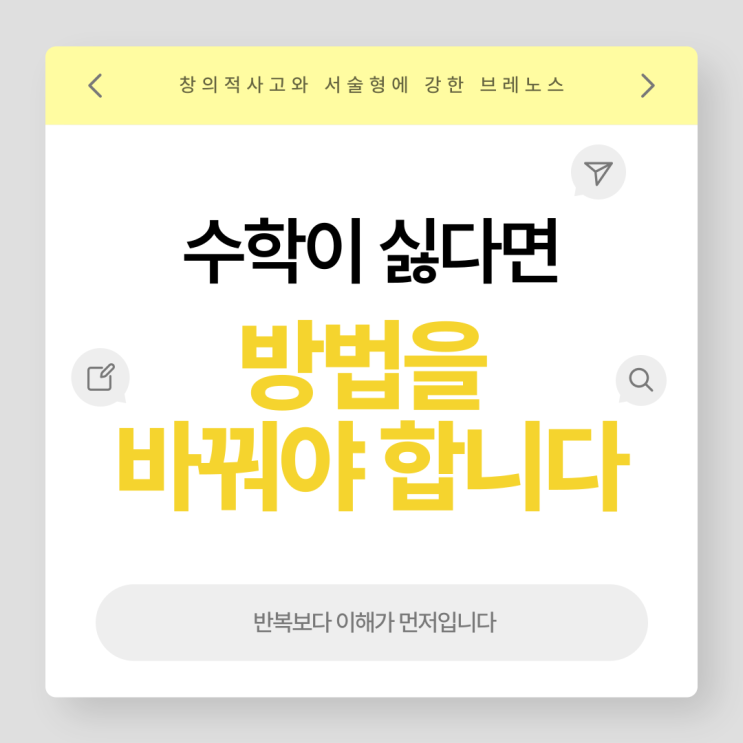 수학이 싫어진 아이, 더 풀게 하면 좋아질까요? 초등 시기에 형성된 수학에 대한 감정은 이후 학습 태도에 큰 영향을 줍니다. 실제로 많은 아이들이 “어렵다”기보다 “자신이 없다”, “재미없다”고 말합니다. 문제를 안 풀어서가 아니라, 충분히 풀었는데도 이해가 정리되지 않아 자신감을 잃는 경우가 더 많습니다. 그래서 질문해야 합니다. 지금 이 아이에게 필요한 건 더 많은 문제일까요, 아니면 다른 방식의 수업일까요? 반복이 항상 답은 아닙니다 반복은 필요합니다. 하지만 이해 없이 양만 늘어나면 상황은 달라집니다. 유형에는 익숙해지지만 변형 문제에 약해지고 틀릴수록 “나는 수학을 못해”라고 단정하며 도전 자체를 피하게....... <img src="https://blogthumb.pstatic.net/MjAyNjAzMDVfODYg/MDAxNzcyNjgwNzE1NzY2.m9uq0Gbet5NoY-XxQenJ1JUpU6OO59f1MLtFExmZ4D8g.NEHP4FC1fwy00PTjEApoDPJBfgc6Qy4hK401D5Hhfi4g.PNG/001.png?type=s3" />