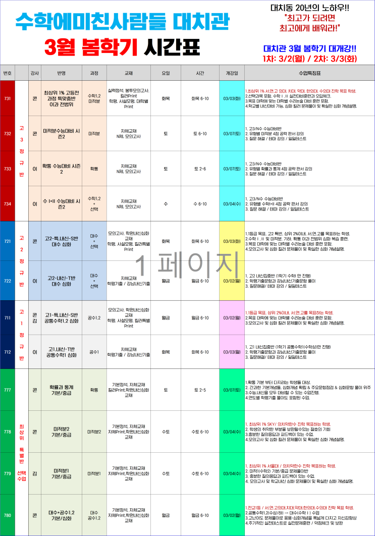 대치동수학학원 수미사대치관 3월봄학기 시간표&세미나 일정