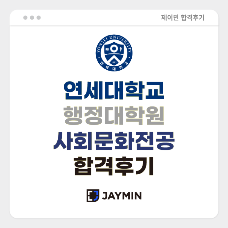 [연세대학교 행정대학원 사회문화전공 합격] 합격을 진심으로 축하드립니다. 연세대학교 행정대학원 사회문화전공 합격후기 안녕하세요, 저는 비전공생이지만 문화예술이 좋아 무작정 문화예술계로 진로를 택한 제이민 수강생입니다. 현재 문화예술 쪽에서 일을 하고 있지만, 취업 준비를 할 때부터 예술과 관련하여 아는 것이 많지 않았기 때문에 배움의 욕심이 항상 있었습니다. 이러한 아쉬움을 채워보고자 제이민아트스터디에서 예술경영 입시에 도전하게 되었습니다. 제이민의 특별한 점은, 다양한 입시 경험에서 우러나오는 철저한 커리큘럼이라고 생각합니다. 비전공으로 예술경영 입시를 준비한다는 점에 두려움이 있었는데, 학업계획서....... <img src="https://blogthumb.pstatic.net/MjAyNjAzMDlfMjcx/MDAxNzczMDM4MDE0ODU5.Om8Lhppy8oQ_g1TYXN3MZvc36aFes_lXgp8HMoEOMO8g.EF_nHcVCVwpR_Zahsu_inRmzyY2tpumBBU8riWDvMjsg.PNG/%B4%EB%C1%F6_1.png?type=s3" />