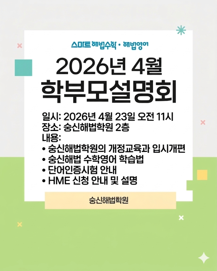 안녕하세요! 스마트해법 숭신해법학원입니다. 급변하는 교육 과정과 입시 개편 소식에 학부모님들의 고민이 깊어지는 시기입니다. 이에 숭신해법학원에서 우리 아이들의 흔들리지 않는 실력을 위해 아주 특별한 설명회를 준비했습니다. 단순한 정보를 넘어, 숭신해법만의 구체적인 학습 전략을 확인할 수 있는 귀한 시간에 학부모님들을 초대합니다. 2026년 4월 숭신해법학원 학부모 설명회 안내 변화하는 입시 제도를 정확히 분석하고, 숭신해법학원만의 탄탄한 수학·영어 학습법을 공유하는 자리입니다. * 일시: 2026년 4월 23일 오전 11시 * 장소: 숭신해법학원 2층 * 참가신청 : 주요 설명 내용 이번 설명회에서는 학부모님들....... <img src="https://blogthumb.pstatic.net/MjAyNjA0MDJfMjI2/MDAxNzc1MTEzNTU2NjYw.8n4AbYmZrlGEhvKr1n00T5y4vN4W2bBGEhLfhVjaJeYg.0sAN5WxzTUD1gYq8-SC7xqCD76oBKHdoALZqMWU_kOsg.PNG/1775112622449.png?type=s3" />