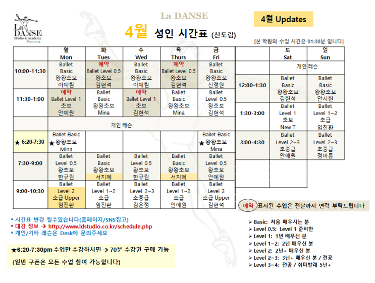 *3월 시간표 3/31까지 진행* ▶수업은 매일매일 진행합니다 →일반 쿠폰은 모든 수업 참여 가능(특강 제외) →6:20수업만 수강 쿠폰 옵션도 가능 ▶ "예약"표시된 수업-> 전날까지 미리 연락 부탁드립니다 (010-9632-9422) ▶대강 정보: http://ldstudio.co.kr/schedule.php <img src="https://blogthumb.pstatic.net/MjAyNjAzMzBfMjk4/MDAxNzc0ODY4MTU2Nzg3.EPd1KuJoDIezUtdZi_NWE9JdK06fXeAtgsdnCjxed0gg.awjllnMkgWCt00IoX8He4XXH0Vqd9qBOtFpd5WZyv2gg.PNG/sindo_april_tt_update.png?type=s3" />