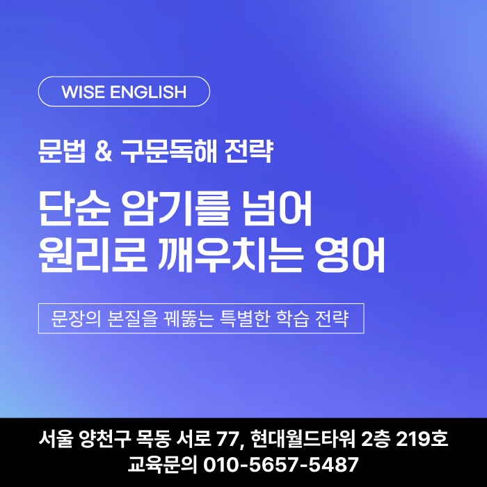 안녕하세요. 양천구 목동에 위치한 와이즈영어는 단순한 문제 풀이가 아니라, 학생 눈높이에 맞춘 맞춤 지도와 이해 중심 수업으로 차근차근 실력을 쌓아가며, 영어에 대한 자신감과 흥미를 함께 키울 수 있는 환경을 만들어 줍니다. 많은 학생이 영문법을 오랜 시간 공부하고도 막상 실제 문장을 만나면 해석에 큰 어려움을 겪곤 합니다. 단어가 조금만 바뀌어도 아는 문법이 낯설게 느껴지기 때문이지요. 오늘은 단순한 내용 설명과 문제 풀이의 굴레를 벗어나, 문장의 본질을 꿰뚫는 와이즈영어만의 특별한 학습 전략을 상세히 소개해 드리겠습니다. 왜 문법을 배워도 독해가 잘 되지 않을까요? 와이즈영어의 '영문법 & 구문독해....... <img src="https://blogthumb.pstatic.net/MjAyNjAzMzBfODIg/MDAxNzc0ODY1ODUxNjE3.cGnPzjhrcF_jtYYY3nGLPdE6hqIPNJozJZioaCz6Y5Yg.SeODUKI5RslYgTb1i0AfKDM2KPKBh4YmL9ogF_5DrYkg.PNG/1.png?type=s3" />