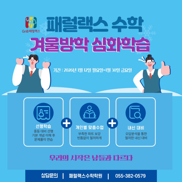 ❄️ 패럴랙스수학 겨울 심화과정 시작! 달라진 학습 루틴, 업그레이드 되는 실력 이번 주 월요일부터 패럴랙스수학 겨울 심화학습이 본격적으로 시작되었습니다. 겨울방학을 어떻게 보내느냐에 따라 학기 초 심지어 한 학년의 성적이 극명하게 갈리는 시기이죠. 그래서 매번 겨울은 조금 더 깊게, 조금 더 단단하게 나아가는 시간을 가집니다. ⛄ 심화학습의 의미 겨울 심화학습은 단순한 ‘방학 보충’이 아닙니다. 아이들이 평소 놓쳤던 부분을 메우고, 선행 개념을 안정적으로 쌓아 새 학기에 도약하는 힘을 만드는 핵심 과정입니다. ✔ 매일 2시간의 집중된 학습 ✔ 집중력 + 지구력 강화 훈련 ✔ 선행학습과 취약 영역 보완 이 3가....... <img src="https://blogthumb.pstatic.net/MjAyNjAxMTVfMjQ1/MDAxNzY4NDc2NDc4NDIy.QlyBSz7nvT4hzPQyoJDFirHmlzOHT3MDy6uMdZ9ltZwg.LZOetH90ckAqGbzXCbf99X_LvPF5GftryI0retgIiE4g.PNG/d_26dUd018svcyvwom3y0hz81_tx2fag.png?type=s3" />