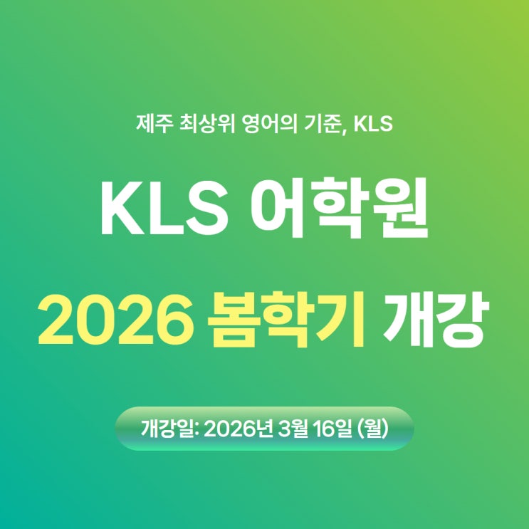 안녕하세요. 제주 영어학원 KLS 어학원입니다. 따뜻한 봄기운과 함께 KLS어학원의 2026 봄학기가 시작됩니다. 초3부터 고3까지 이어지는 체계적인 영어 교육 시스템으로 제주 지역 최상위권 학생들이 선택하는 프리미엄 프로그램입니다. 이번 봄학기 역시 제주시 초등 영어 잠재력 형성, 제주시 중등 영어 최상위권, 제주시 고등 영어 1등급 달성을 목표로 하는 학생들을 위한 맞춤 커리큘럼으로 운영됩니다. 개강일은 2026년 3월 16일(월)이며, 원장님 상담 및 반 편성은 사전 예약제로 진행됩니다. 제주 최상위권 학생들은 왜 KLS를 선택할까요? 제주 영어학원 KLS 어학원은 제주시 최상위권 학생들이 선택하는 프리미엄 영어학원입니다. 차별....... <img src="https://blogthumb.pstatic.net/MjAyNjAyMjhfMTA4/MDAxNzcyMjUyMDY2MTU2.S0q2P4KIyJtflp-d7MYoWR4MLUH9s2K2UnfNgIG_Pr0g.68X2b21etSh9vVvbFA0ORkJFROZORI7qOl5DXJSH4lwg.JPEG/%C1%A6%B8%F1%C0%BB_%C0%D4%B7%C2%C7%CF%BC%BC%BF%E4_-_2026-02-28T120227.591.jpg?type=s3" />