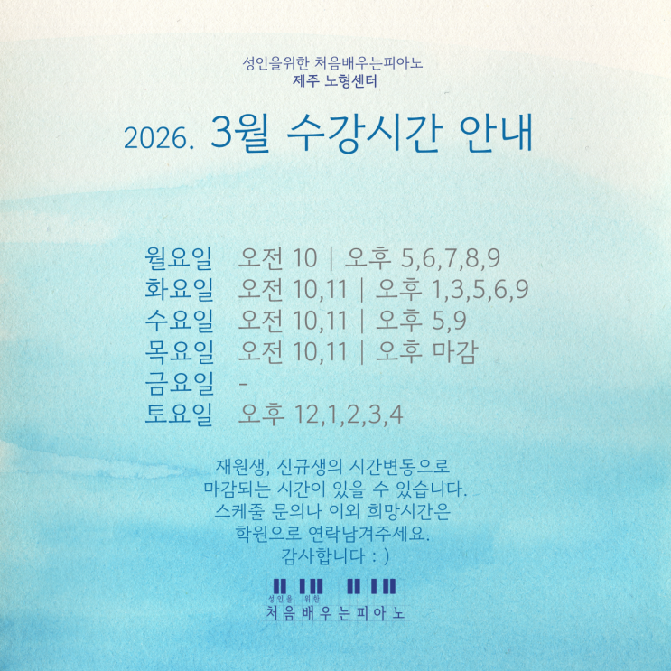 3월 성인 피아노 수강 가능 시간 안내 안녕하세요, 처음배우는피아노입니다 : ) 설 연휴가 끝나가고, 곧 새학기가 시작되네요 ! 새로운 마음으로 피아노를 시작하시려는 문의가 점점 늘고 있습니다. 현재 3월 수강 가능한 시간 안내드립니다. (현재 남은 2월도 잔여석 있으니, 편하게 문의주세요 ! 수강기간은 수업 시작일부터 시작되어요 ^^) ※ 시간은 선착순 등록으로 확정됩니다. ※ 상담 후 정확한 가능 시간 안내드려요. 피아노는 늦지 않습니다. 악보를 전혀 못 보셔도 완전 ! 괜찮습니다 : ) 취미로, 힐링으로, 혹은 오래 미뤄둔 꿈을 다시 꺼내는 시간으로. 3월, 조용히 시작해보셔도 좋겠습니다 상담은 편하게 문의 주세요. ....... <img src="https://blogthumb.pstatic.net/MjAyNjAyMThfMjI5/MDAxNzcxNDAzNzczOTYw.ddPDAz6SGlGQKlil-Nv6sYvHertL5uwHbcfNAvYM9iIg.sSdqUTQ74ct6U2M4HMfle-532y2wAI9TJ11QpByM7jIg.PNG/002.png?type=s3" />