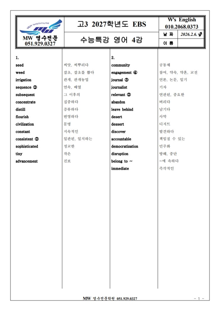 부산 동래구 명륜동 영어 엠더블유MW영수전문학원입니다. 2026년 2월, 고3 학생들을 위한 2027학년도 EBS 수능특강 영어 4강,5강,6강,7강 필수단어입니다. 본원의 학생들은 현재 EBS 연계교재를 모두 구입했고, 남은 1학기 내신대비와 모의고사를 위해 열심히 단어를 외우고, 내신대비 복습을 위한 필기를 더욱 꼼꼼히 할수 있도록 학습하고 있습니다. 올해도 좋은 결과 있기를 바랍니다. MW 051 929 0327 영어 010 2068 0373 수학 010 4726 2678 * 대부분 저희가 직접 강의중이라 통화가 어려운 경우에 문자남겨주시면 전화드립니다~ #명륜동영어 #엠더블유영수전문학원 #내성고영어 #사대부고영어 #중앙여고영어 #대명여고영어 #사직고영어 #이....... <img src="https://blogthumb.pstatic.net/MjAyNjAyMTBfMjc5/MDAxNzcwNjc2ODg2OTUw.KYxHMf7cx2_YpaPCfziqpmu5ACmVcXyKGs0ZK8qd854g.kAKlKUO_fFbqAs6yGVvWvvgG8Ki4y-yW2yCuD9oPIhsg.JPEG/2027%C7%D0%B3%E2%B5%B5_EBS_%BC%F6%B4%C9%C6%AF%B0%AD_%BF%B5%BE%EE_4%B0%AD_%B4%DC%BE%EE_1.jpg?type=s3" />