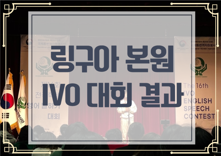 제16회 IVO 전국 학생 영어말하기 대회 안녕하세요, 학부모님 여러분! 자랑스러운 소식을 전해드립니다. 2026 제16회 IVO 전국 학생 영어말하기대회에 출전한 링구아어학원 학생들이 참가자 전원 수상이라는 놀라운 성과를 거두었습니다! 수상현황 대상 수상자만 무려 17명, 최우수상 21명, 우수상 4명까지, 출전한 모든 학생이 빠짐없이 상을 받아왔습니다. 특히 대상 수상 비율이 압도적으로 높다는 점에서, 우리 학원 학생들의 영어 스피킹 실력이 전국 수준에서도 확실하게 인정받고 있음을 보여줍니다. 수상자 명단 (일부 발췌) 대상: 강○영(온샘초4), 김○현(장산초2), 김○원(금빛초4), 김○안(삼육초5), 문○은(남문초3), 박○영(동래초....... <img src="https://blogthumb.pstatic.net/MjAyNjAyMTJfMTIy/MDAxNzcwODc3MDE5MjY5.OS2M5DV9T03U-l5mwNu6OVsrNAAMAlaImyK8OHabnG0g.uA7S7YxL6uL-wa8Pc7fCPjt2i_9M5OG8uzFP5QLfVhUg.PNG/IVO-001.png?type=s3" />