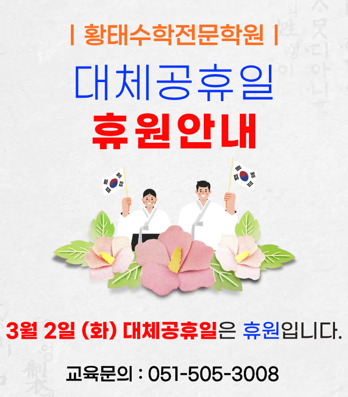 안녕하세요. 학부모님과 학생 여러분께 안내드립니다. 3월 2일 (화) 대체공휴일로 인해 아래와 같이 휴원합니다. 대체공휴일 휴원일 : 3월 2일 화요일 해당 기간에는 정규수업 및 보강수업이 모두 진행되지 않습니다. 수업 일정에 착오 없으시길 부탁드립니다. 삼일절의 의미를 되새기며 뜻깊은 시간 보내시기 바랍니다. 감사합니다. 상담문의 전화문의 : 051-505-3008 문자문의 : 010-5130-3008 <img src="https://blogthumb.pstatic.net/MjAyNjAyMjdfNjgg/MDAxNzcyMTIxNDAwNTgx.2nxExxmC1ctHnZVMS69JebmI9v6baQclUYx-sQiSkFQg.nEGU-zM3XUF69tPJzFcJusZk9LZqMrTkmCI_nbVF5Msg.PNG/%C1%A6%B8%F1%C0%BB_%C0%D4%B7%C2%C7%D8%C1%D6%BC%BC%BF%E4..png?type=s3" />
