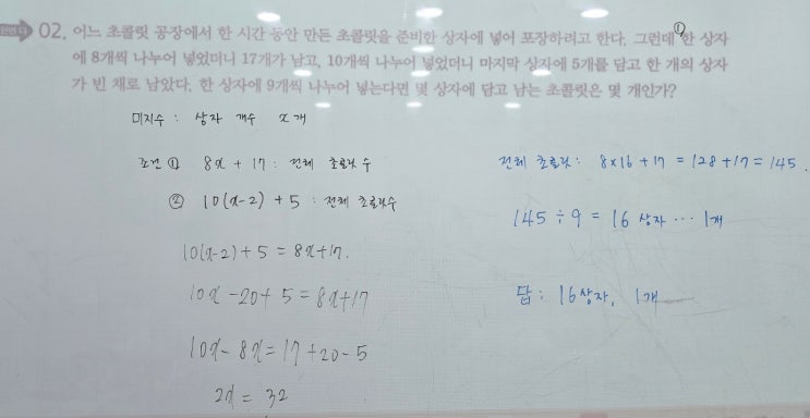 안녕하세요, 루트원 1-2 담당 엄소정입니다. <프라임 오답 정리> p63. 일차방정식의 활용- 학생 수 구하는 것: 올해 남학생 수 조건 ① 지난해 학생 수 1600명 조건 ② 올해 남학생 수: 지난해보다 7% 증가 조건 ③ 올해 여학생 수: 지난해보다 4% 감소 조건 ④ 올해 학생 수: 전체적으로 35명 증가 [발문] 각 조건은 무엇을 기준으로 설명하였나요? 미지수: 지난해 남학생 수 명 → 지난해 여학생 수: (전체 학생 수)-(남학생 수) 남학생 여학생 전체 지난해 (1600-) 1600 올해(증감) +7% -4% +35 (7/100)-(4/100)×(1600-)=35 7-4(1600-)=3500 분배법칙으로 괄호를 풀고, 정리하면 =900 ....... <img src="https://blogthumb.pstatic.net/MjAyNjAzMDFfMjYz/MDAxNzcyMzU4Nzc3NjE0.69AwbQcYQzlQnkI2zXIYBgZthpNBm2M3jazK3jdemV0g.jrUFIkrJgm-z8UlKdfzt1HB_LERGxSJUeEIP2qcqLtYg.JPEG/KakaoTalk_20260223_221005824_01.jpg?type=s3" />