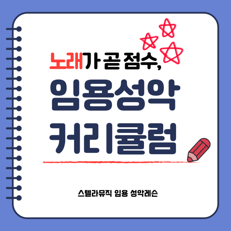 안녕하세요! 스텔라뮤직 다다쌤입니다. 2027년 대비 음악 임용 2차 성악레슨 커리큘럼에 대해 알려드립니다. 임용 성악레슨은 사람마다 현 상태가 다르기 때문에 그에 맞는 맞춤형 레슨을 진행합니다. 그래서 1:1 레슨만 진행합니다. 그리고 기간은 짧게는 5개월, 기본 6개월 과정으로 진행됩니다. 이 과정은 수강생의 상황에 따라서 약간 유동적일 수 있습니다. 스텔라무지크의 임용 성악레슨은 임용 실기에서 ‘노래’라는 강점을 만들어 점수를 더 얻어갈 수 있도록 돕는 과정이며, 동시에 학교 현장에서도 노래로 소통할 수 있는 음악교사를 양성하는 것을 목표로 합니다. ※ 이 커리큘럼은 이런 분들을 위한 과정입니다 ★성악 전공이 아닌....... <img src="https://blogthumb.pstatic.net/MjAyNjAyMDJfMjk3/MDAxNzcwMDAwMDc2MTIy.OoJMJ3sYME5uZo0mfps3PN6-rNcmbjr6FSsoXkprQ7Ug.X9tGW23__9B6DW4y7V4A4t-FIazOIvAUcmP-KARFYRQg.PNG/%C1%A6%B8%F1%C0%BB_%C0%D4%B7%C2%C7%D8%C1%D6%BC%BC%BF%E4._%285%29.png?type=s3" />