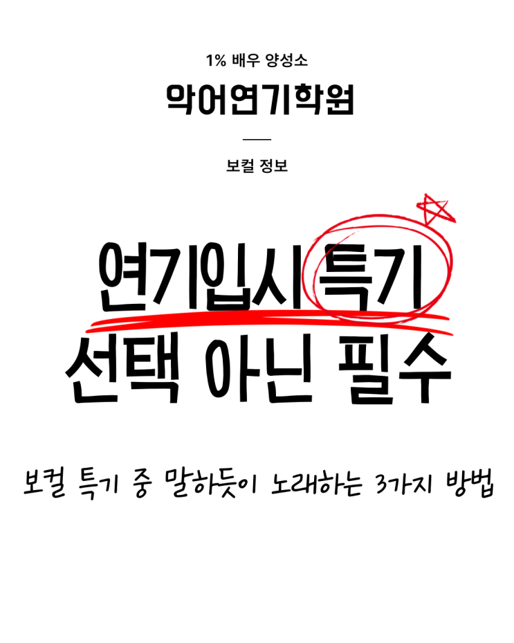 연영과 특기 비중 점점 높아져 연극영화과 입시에서 특기의 비중은 해마다 높아지고 있습니다. 하지만 특기를 얼마나 잘하느냐도 중요하지만 그 특기를 통해 무엇을 전달하고 있느냐입니다. 자유연기는 물론, 무용은 몸으로 말해야 하고 보컬 역시 노래를 통해 인물의 감정과 생각을 얼마나 설득력 있게 전달하고 있는지를 보여줘야 하기에 넘버의 가사를 노랫말을 넘어 인물의 대사로 접근해야 합니다. 오늘은 특기 중에서도 보컬 특기를 준비하는 입시생들을 위해 소수정예연기입시학원 악어연기학원에서 말하듯이 노래하는 법 3가지에 대해 알려드리려고 합니다. 1. 정확한 발성과 호흡 사용하기 보컬 수업은 그냥 노래 수업이 아니라, 발성과....... <img src="https://blogthumb.pstatic.net/MjAyNjAxMTJfNzkg/MDAxNzY4MTg3NzIwNTg4.4nNPetGFKy_9dAloMrfqRlvg-iNU5xGyD0q8xPOKkTIg.ObbwBvnpzkRxeLiQDfxtQvEyRqbGc2IQeojzwsEx49Qg.PNG/001.png?type=s3" />